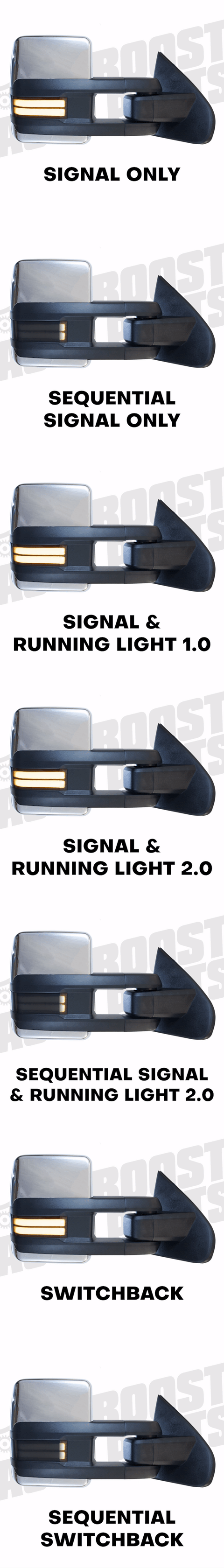 Signal & Running Light 2.0: The lights will flash as a turn signal. At night when the running lights are activated, the lights will operate at 100% intensity for running light, 100% intensity for turn signal.