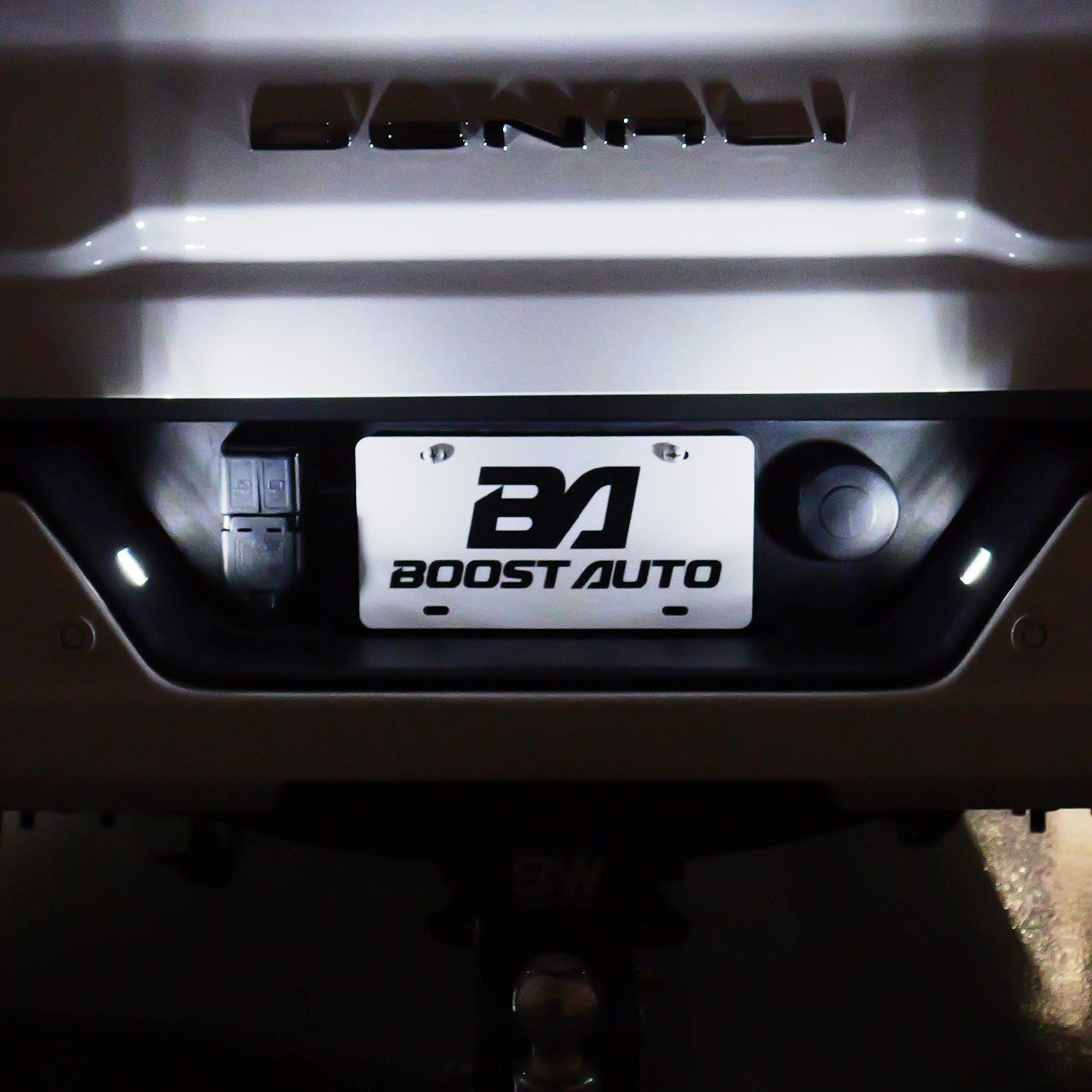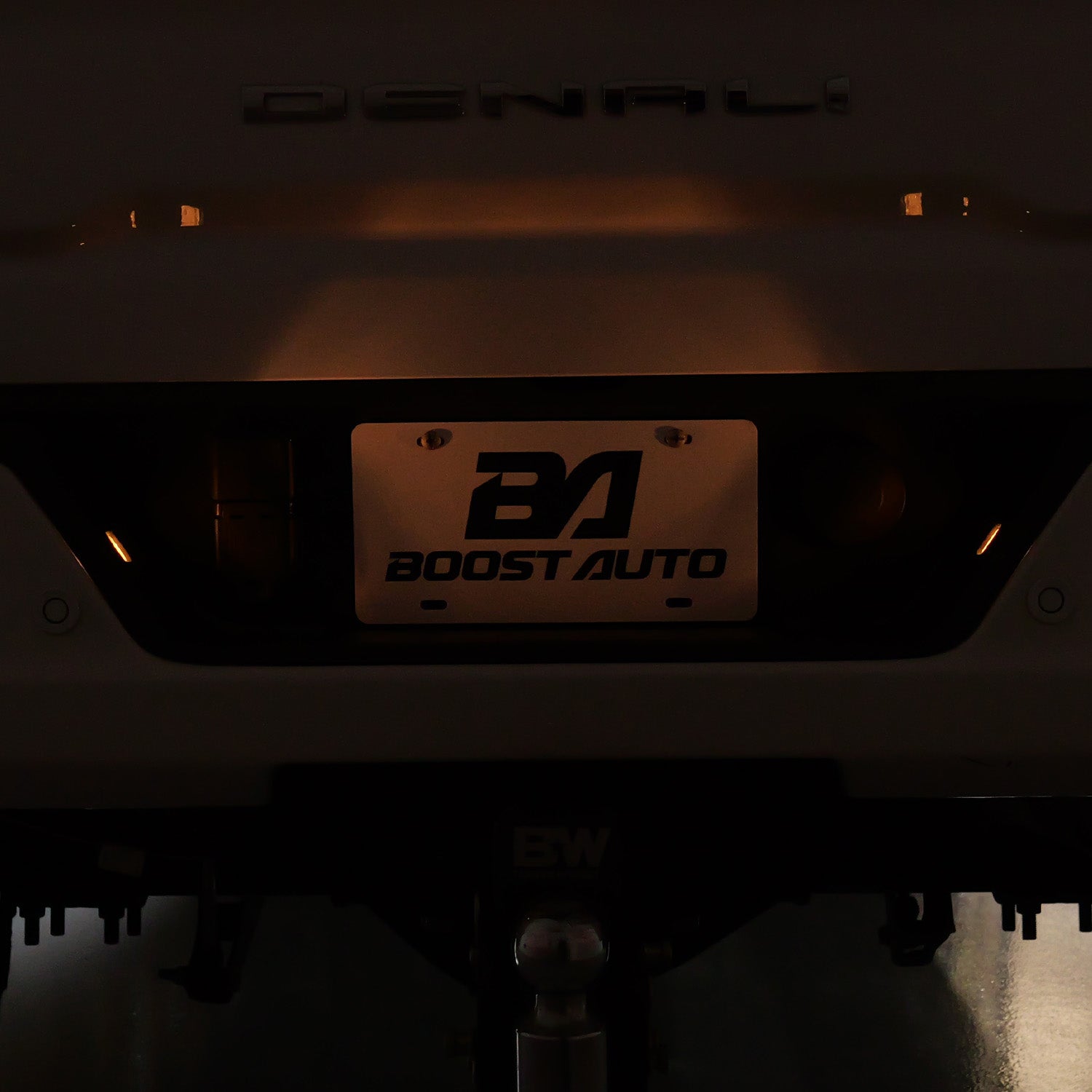 Upgrade the look of your truck with Boost Auto’s LED License Plate Light Kit for 2020-2025 Chevy Silverado and GMC Sierra 2500/3500 HD trucks. Designed for a perfect factory fit, this kit replaces the dull, yellow factory bulbs with crisp, bright white LEDs that are 15 times brighter for a modern look and improved rear visibility.