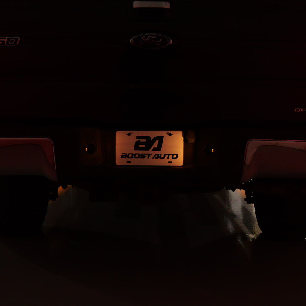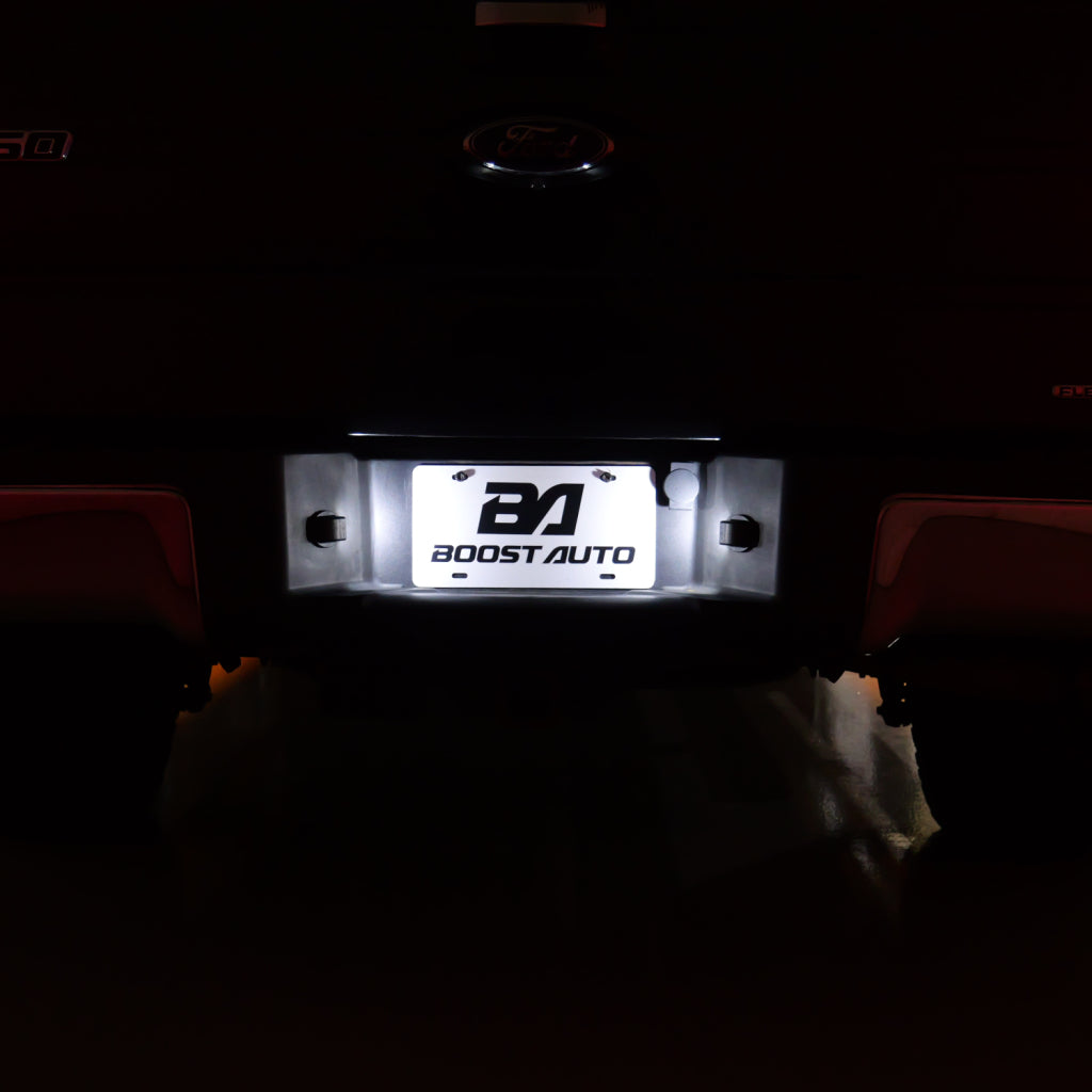 Upgrade the look of your truck with Boost Auto’s LED License Plate Light Kit for the 2004-2014 Ford F-150 trucks. Designed for a perfect factory fit, this kit replaces the dull, yellow factory bulbs with crisp, bright white LEDs that are 15 times brighter for a modern look and improved rear visibility.